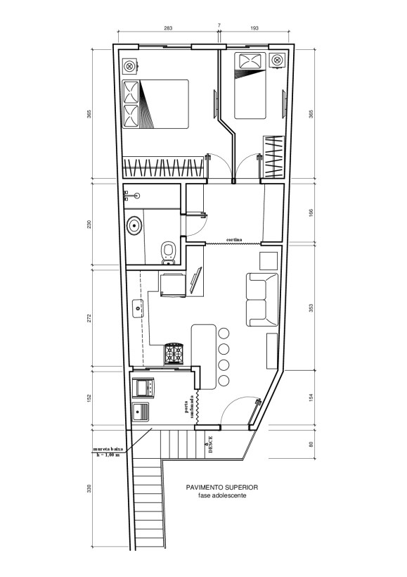 - Envio duas versões para o quarto: a primeira para ser adotada enquanto a criança for pequena, é a melhor opção para a ventilação e aproveitamento dos espaços. Na segunda, que talvez se imponha quando a criança se tornar adolescente, uma simples parede de gesso acartonado fará a divisão, construída sobre o piso, sem quebrar nada, mantendo ainda uma boa ventilação, embora deixe os quartos sensivelmente mais apertados.